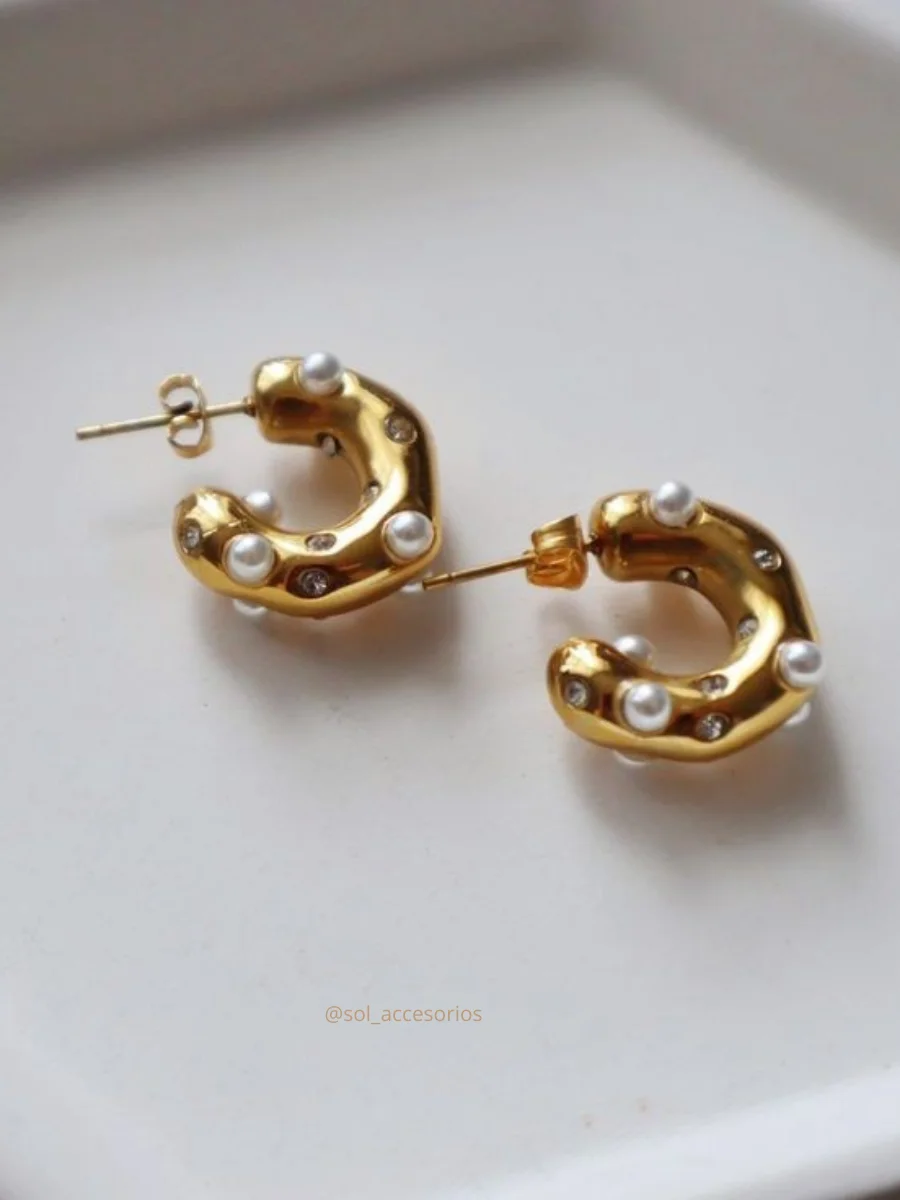 Aretes en forma de argolla con brillantes y mini perlitas, de estilo clásico y elegante, lucirás radiante y hermosa. Lo recibirás en un lindo empaque que puede ser utilizado para conservarlo por más tiempo.