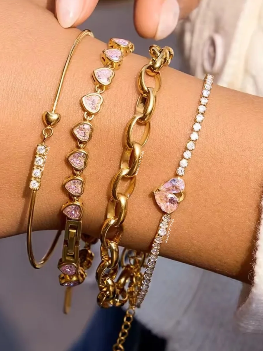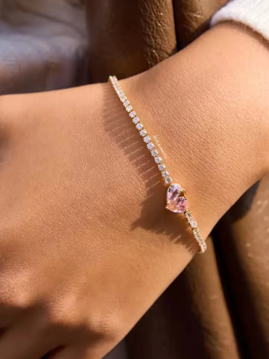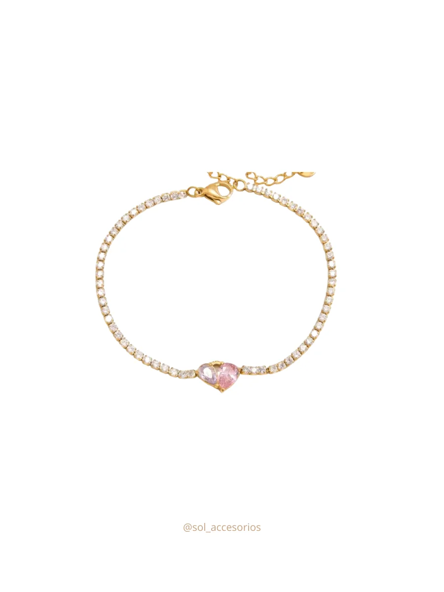 Pulsera de strass con pequeño dije de corazón rosado. Lo recibirás en un lindo empaque que puede ser utilizado para conservarlo por más tiempo