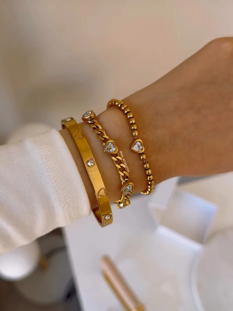 Pulsera de cadenas de eslabones con corazones brillantes. estarás a la moda y con lo último en joyería, captarás todas las miradas.